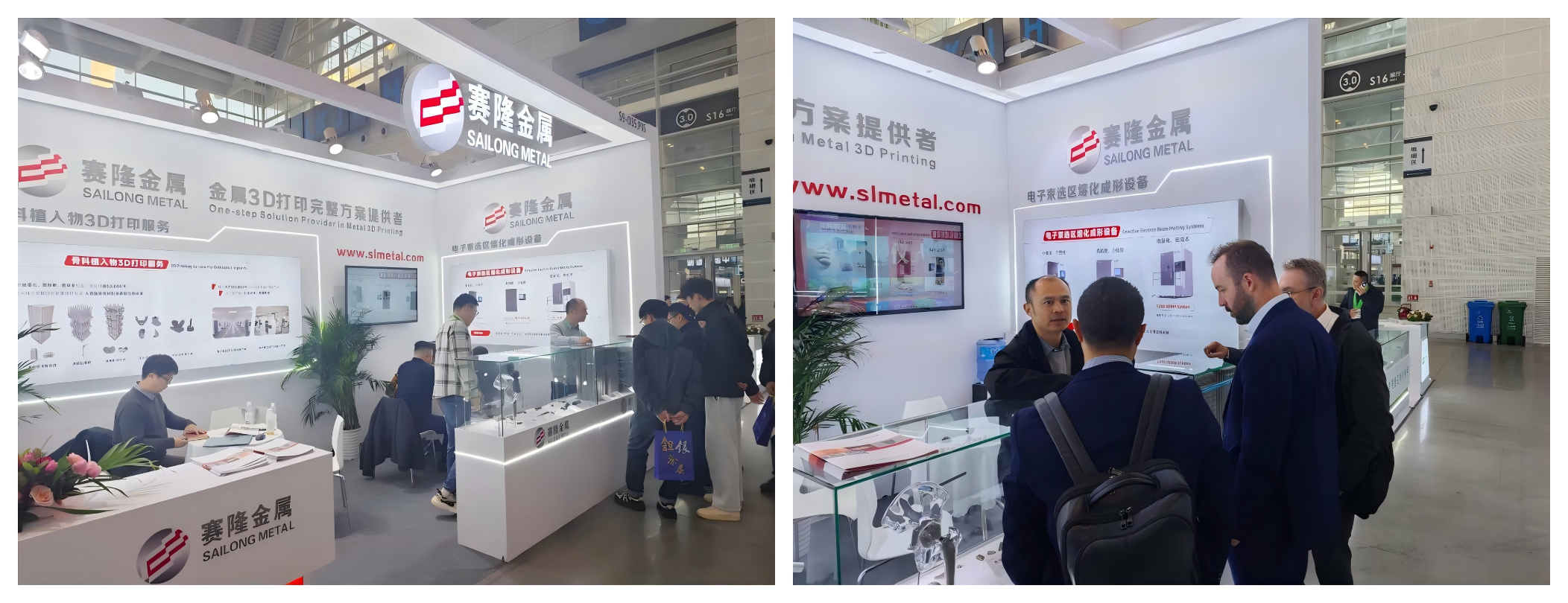 展會期間,西安賽隆集中展示了電子束3D打印技術在骨科領域的核心優勢及典型應用案例,涵蓋關節、脊柱等多個細分領域。在標準化鈦合金植入物批量生產方面,西安賽隆重點展示了滿板打印髖臼杯、滿板打印融合器、滿板打印股骨柄及滿板打印脛骨平臺,全面介紹了公司電子束3D打印骨科植入物的低成本、高效率的獨特優勢。在產品研發與新材料應用方面,西安賽隆展示了多項電子束3D打印創新研發成果,包括個性化鈦合金、多孔鉭墊塊以及鋯鈮合金踝骨、橈骨、膝關節等新型假體案例。公司參展團隊與來自國內外多家知名醫療機構的臨床醫師、科研人員等圍繞骨科植入物的創新設計、注冊認證、臨床轉化及應用前景等方面進行了深入交流,共話精準醫療、數字醫療新發展。
